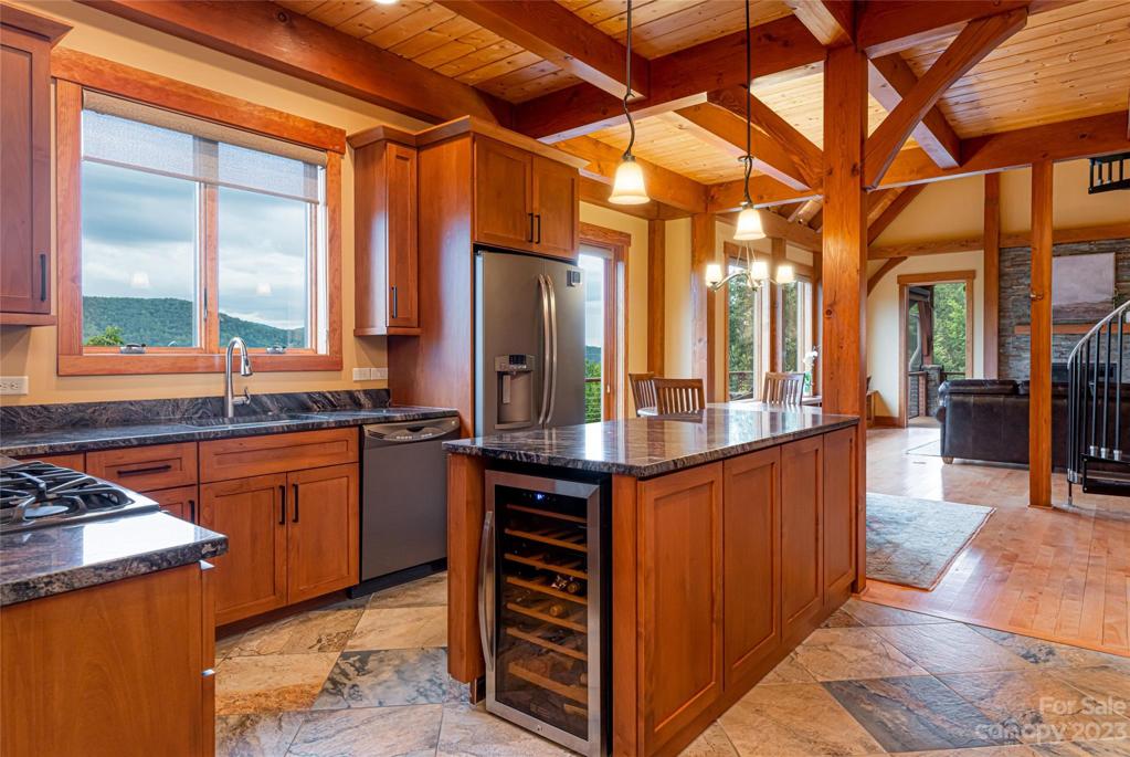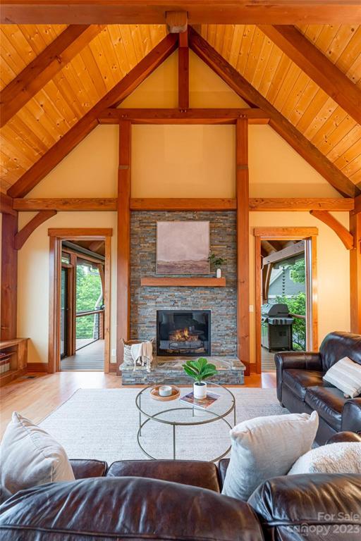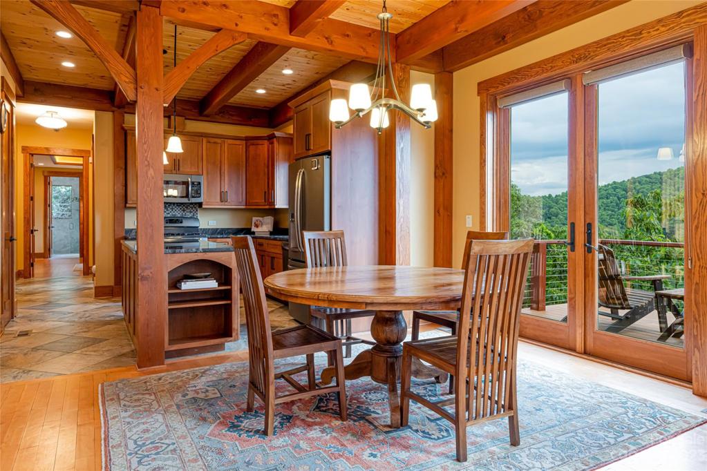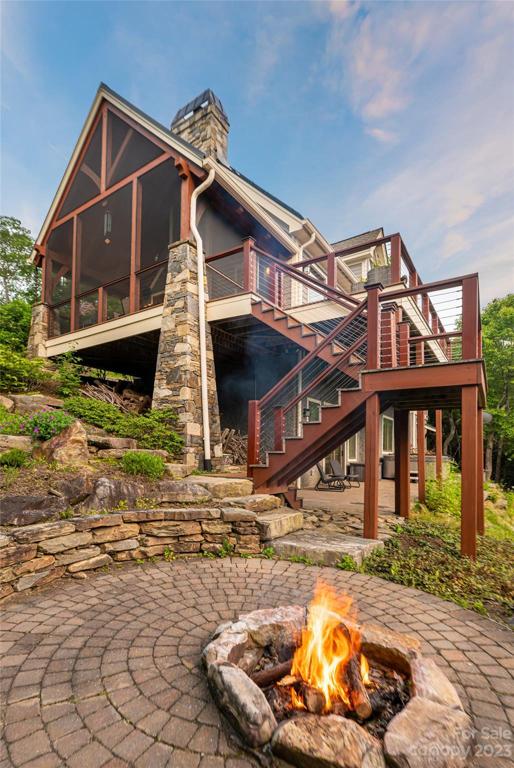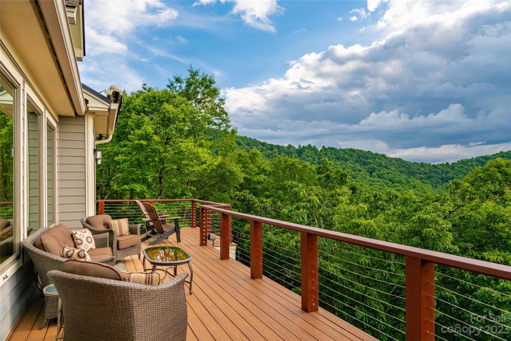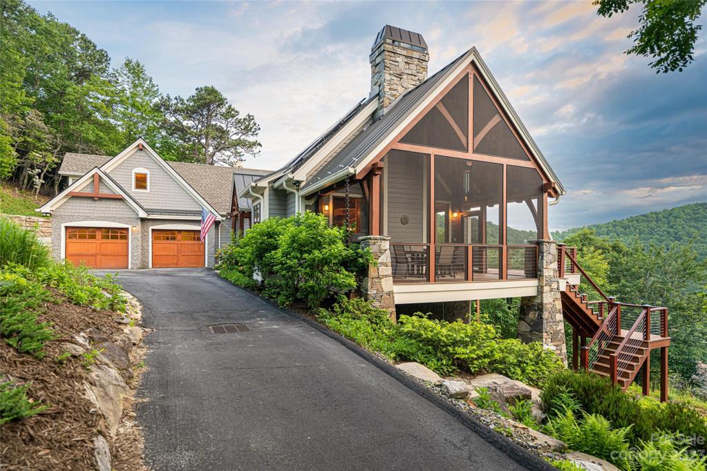 Nestled in the Blue Ridge Mountains, this Green built home by LivingStone offers stunning views of Pisgah Nat'l Forest and the Blue Ridge Parkway. Meticulously crafted with sustainability in mind, the great room greets you with its beautiful TimberPeg post and beam wood ceiling. This cozy room flows seamlessly into the kitchen, expansive deck, screened porch & primary suite, all designed to maximize the incredible views. Upstairs, an open loft connects to a bedroom through a secret door! The lower level includes a family room adorned with bookshelves, an additional bedroom & bonus room. An elevator connects the main & LL for comfort and convenience. Geothermal heat/AC, ERV system, solar panels & E-charging enhance the sustainable living experience. Situated in a gated community, residents enjoy walking trails, an outdoor pool & recreation area, all while being minutes from South Avl amenities. This home is a true mountain retreat offering privacy, convenience, and breathtaking scenery!
