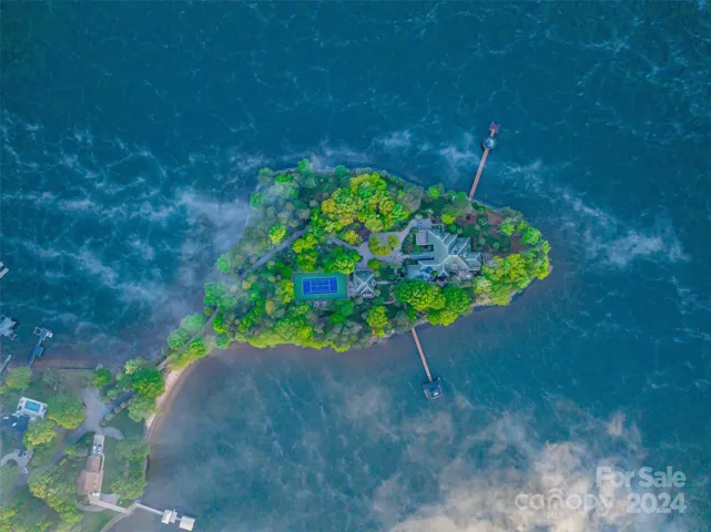 The crown jewel of Lake Norman, Merancas Island is a once-in-a-lifetime opportunity, located on palatial private island. With 520 miles of shimmering shoreline, the lake offers year-round enjoyment and is conveniently located less than 30 minutes from Uptown Charlotte. This incredible estate was designed by Harry Schrader and offers a truly resort-like lifestyle unlike any other. A gated driveway winds past the 2-bedroom guest house and leads to the primary residence. The main home features remarkable architectural details, including a two-story stone fireplace; you have breathtaking views from every room. The 4.5-acre island boasts a private tennis court, sandy beach, kayak/paddleboard launch ramp, covered boat dock with sunrise views, and gazebo dock with spectacular sunset views. Lush tropical grounds with palm trees and sculpture gardens, a garden shed and even a dog house. There simply isn't another property on Lake Norman offering this lifestyle for the discriminating buyer.