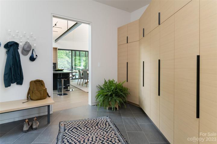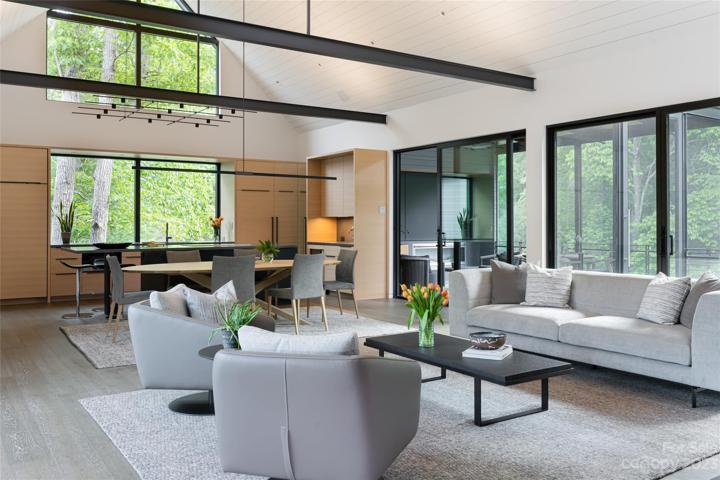Masterfully designed, this residence is grounded but polished, and designed to complement the surroundings. Seamlessly integrated, the exterior and interior elements create a sense of artistry. The attention to detail is evident from the moment you step in, where a floating staircase guides you up to the glass office to provide an immersive connection to the outdoors. As you move further into the home, you'll discover the elegant great room. Adorned with a 3-sided fireplace that is nothing short of a masterpiece.The ceiling boasts nickel-back wood that extends the expanse, harmonizing with steel beams that draw your gaze towards the kitchen with custom cabinetry and concrete countertops.The main level primary suite, with a walk-in closet and spa-like bath is a relaxing retreat.The lower level family room, 2-ensuite BR, laundry, and exercise room, adds to the functionality. Outside, a curated native plantings and bluestone pavers complements the overall design,creating a serene setting.