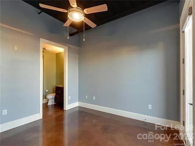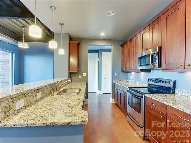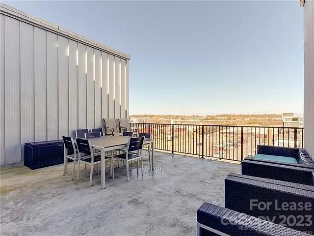 NoDa! NoDa! Sought after Arts District mid-rise with Rhino Market right outside your front door! Great location, great top floor 2 BR, 2 BA condo with true urban appeal. Great skyline views and photogenic western sunsets from your personal private terrace balcony. Exposed 12 foot ceilings, 8 foot bedroom doors for privacy, plus attractive stamped concrete floors. Large newly redesigned walk in closets in both rooms. Granite counters in kitchen and baths. Awesome kitchen space with seated counter area - gorgeous cabinets and stainless appliances. Designer lighting. Secured building. This home comes with one reserved parking space, a premium spot, right at the front door.