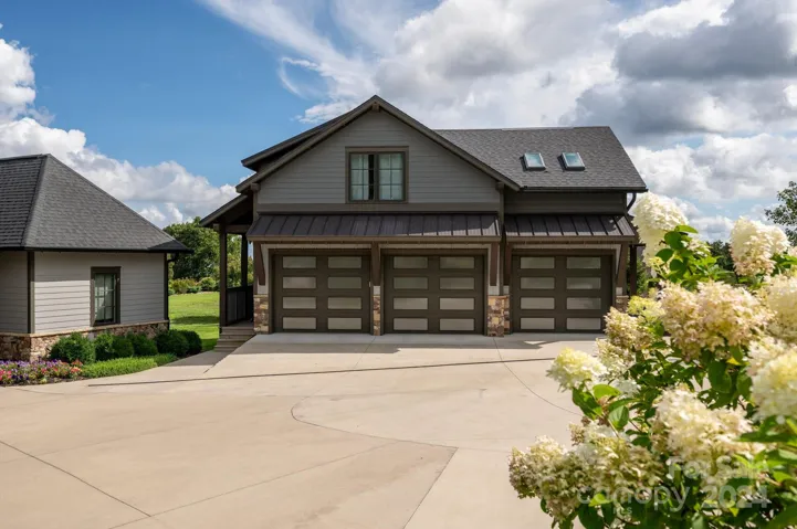 Luxurious, west-facing Mountain Modern multi-generational design with open, single-level floor plan and long-range mountain views, vaulted great room ceiling with beams, Spanish oak-stained hardwood floors, quartz countertops, stainless French-door refrigerator, dishwasher, and six-burner gas range (all Thermador), in the gated community of Grand Highlands of Bearwallow Mountain. This like-new 2016 Robert Sulaski build (with 2022 addition by Sean Anderson) offers abundant natural light, three stacked stone fireplaces, a wine cellar in garage, and a separate, expansive and private guest wing. Thoughtfully designed for “aging in place,” there are also separate guest quarters that make a great flex space/media room/studio space over the detached three-car garage. Garage also features 198 SF of heated workshop space plus an extra 904 square-foot loft with another full bathroom not included in SF.
