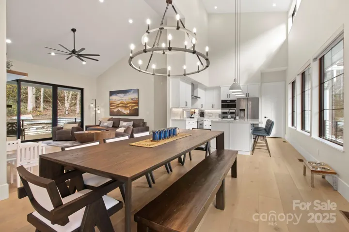 781 Evergreen: Newly constructed mountain contemporary home w/ ONE LEVEL LIVING in gated community of Hound Ears- great full-time residence, getaway, or investment property w/ short-term rentals permitted (w/ restrictions)! Located between Boone & Blowing Rock, Hound Ears is accessible year-round. With a bright, modern design & large glass windows & door connecting the indoors to out, enjoy a rustic mountain setting w/ natural elements in a contemporary feel! Open-concept floor-plan offers 4BRs & 3.5BAs, attached 2-car garage, & multiple outdoor living spaces. Spacious living & dining areas w/ vaulted ceilings & large windows open up to the kitchen w/ stainless steel Jennair appliances & walk-in pantry. Primary suite features spacious closet & bath w/ tiled shower & soaking tub. Addt'l features: covered entry, sitting area/foyer, modern ethanol fireplace, wet bar & wine cooler off dining, automatic shades, whole-house humidification & dehumidification systems, waterproofed crawlspace.