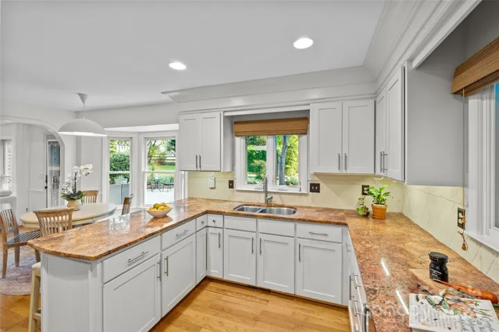 This 4 bedroom residence exudes timeless elegance with distinctive features like arched doorways, beamed ceilings, lustrous hardwood floors, and floor-to-ceiling windows that flood the space with natural light.