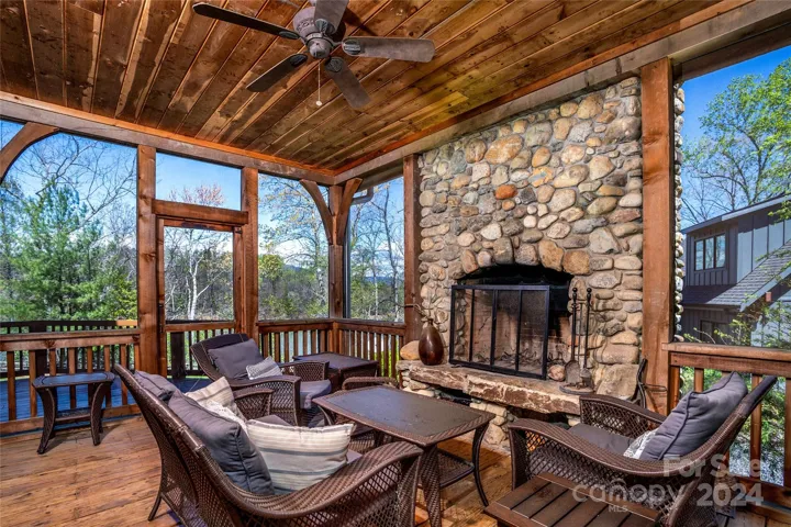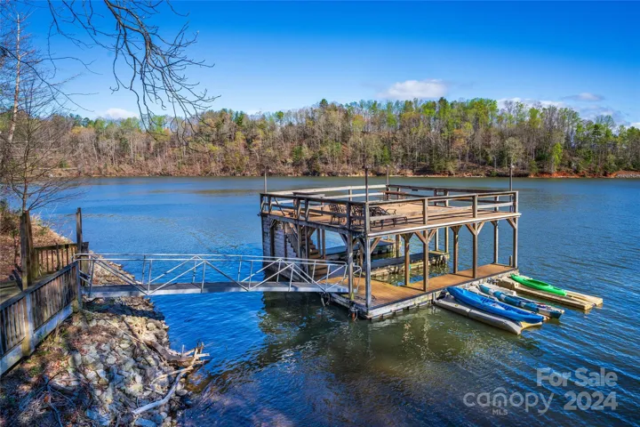 Exceptional waterfront home with stunning post and beam vaulted ceilings and a wall of windows overlooking the flat outdoor space, mountains, and miles of crystal Lake James water. Just beyond the usable back yard, note the substantial double-decker dock and private beach swimming area. These are rare finds around Lake James that allow for extra fun. Gather with family and friends in the oversized living room and screened porch, both with spectacular stone fireplaces. The primary bedroom suite and guest bedrooms are also located on the main floor.