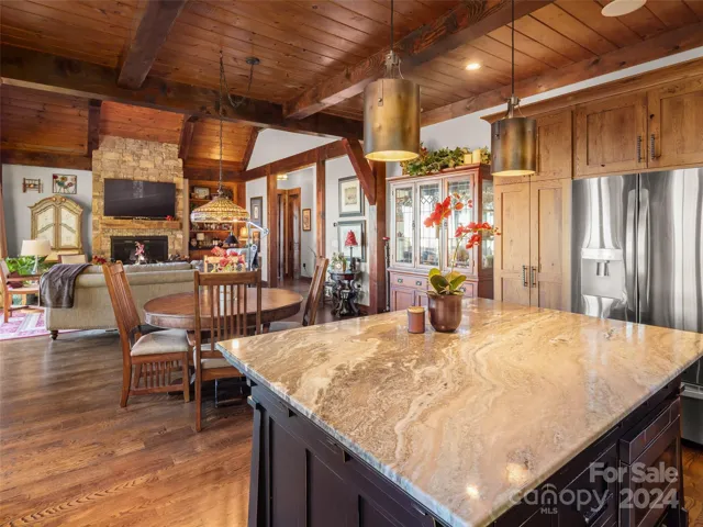Remarkable craftsmanship from the outside in welcoming stunning views overlooking Hendersonville to the SC foothills. Exquisite timber-frame with vaulted ceilings in a Wright-Architecture design. Primary living on the main level with floor-to-ceiling stone fireplace. Well appointed kitchen with large island, luxury kitchen appliances, custom solid oak cabinetry, and casement windows framing the breathtaking views. Spacious lower level features an equally impressive stone fireplace in the living area, wet-bar, two palatial guest rooms, both featuring en-suite baths. Both levels offer sliding glass doors onto large wood decks with the main deck offering a stone fireplace perfect for outdoor entertaining. Oversized garage features 400+ bonus room.
