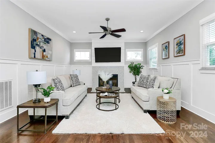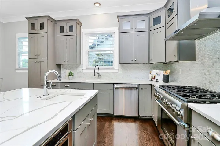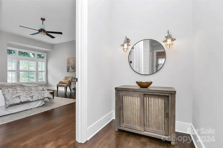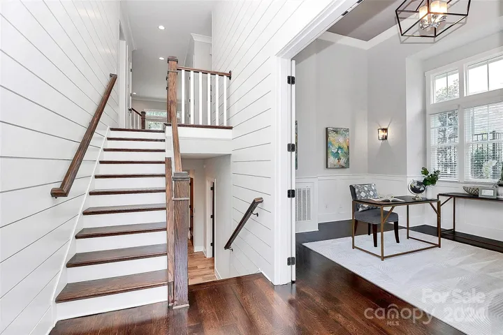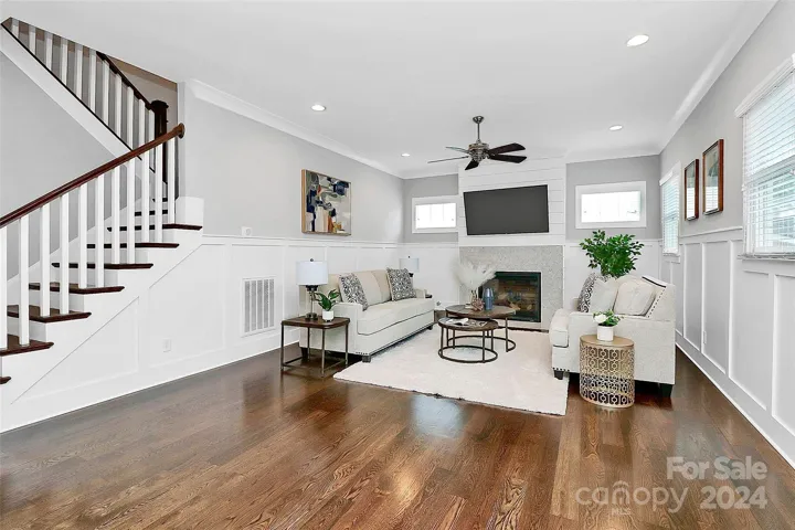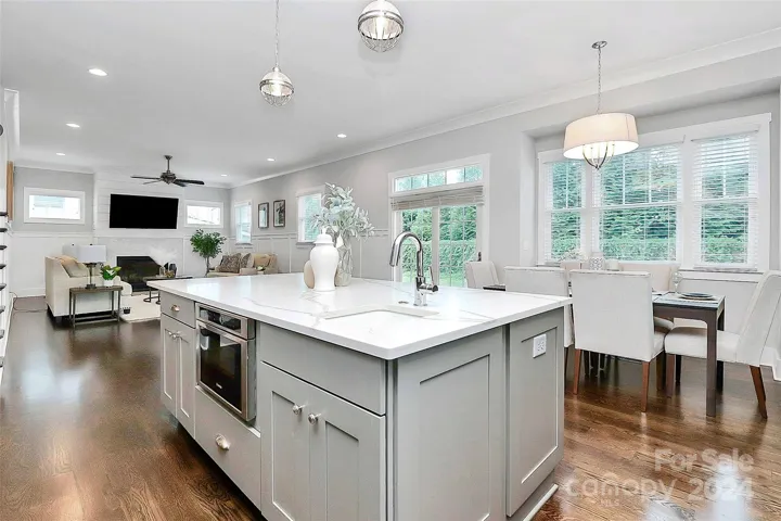 This beautiful open floor plan home features a Gourmet kitchen with lg quartz island w/prep sink, gas cooktop, SS Thermador appliances, soft close drawers and custom cabinets w/pull outs. Hardwood on main. Large Living Room with gas fireplace and dining area. Primary bedroom with large walk in closet and glamour bath w/dual shower heads in shower. 3 bedrooms up, each with a beautiful bath. Basement with media room, full bath, bar w/ tons of cabinets and refrigerator. Home has a personal evaluator to every floor. Home is located right across the street from the Lake. Only a 15-minute walk to downtown Davidson.