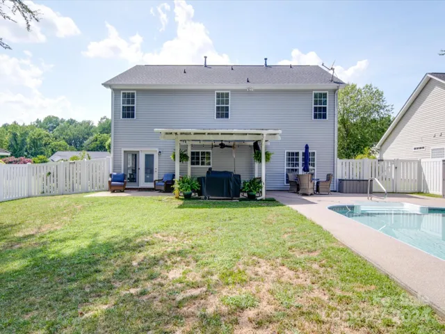 Stunning INSIDE and OUT especially with the Salt water POOL and outdoor covered Pergola! This 2 Story Home has the open floor concept and soaring 2 story ceilings in Family Room that will take your breathe away esp with the natural light. From the moment you enter, your eyes will take in the panoramic view of the spacious family room with free standing see through fireplace that overlooks the breakfast area and wonderful kitchen with white cabinets, black appliances with gas stove and granite countertops. Dining Room can be converted into a office or downstairs bedroom. Wide molding.