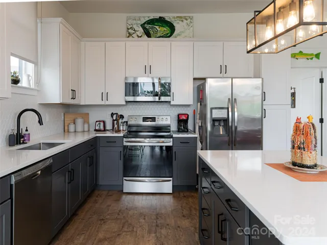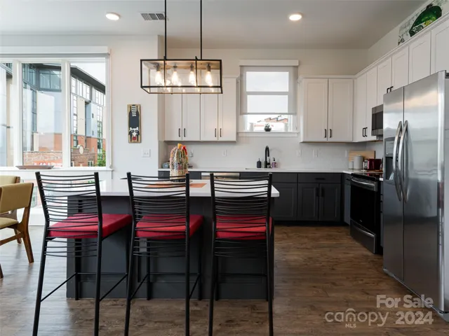 The kitchen features sleek countertops, stainless steel appliances, and ample space for culinary