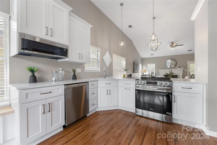 Welcome to this stunning, light-filled ranch-style home featuring 3 bedrooms, 2 baths, and a newly renovated kitchen that’s perfect for both cooking and entertaining. The kitchen boasts elegant white Shaker-style cabinets with crown molding, quartz counters, abundant storage, a charming bench with extra seating, and sleek stainless steel appliances. Luxury vinyl plank flooring flows through the main living areas, while the bedrooms are comfortably carpeted. The spacious primary suite was also renovate. It offers a serene escape with an oversized tiled shower, freshly painted cabinetry, tile flooring, a large walk-in closet, and a separate toilet area. Step outside to enjoy your private garden oasis, ideal for relaxing or entertaining. Additional highlights include a 2-car garage with ample storage and a pull-down attic for even more space. This home is truly a welcoming retreat! Front Lawn Maintained, brand new HVAC and furnace.