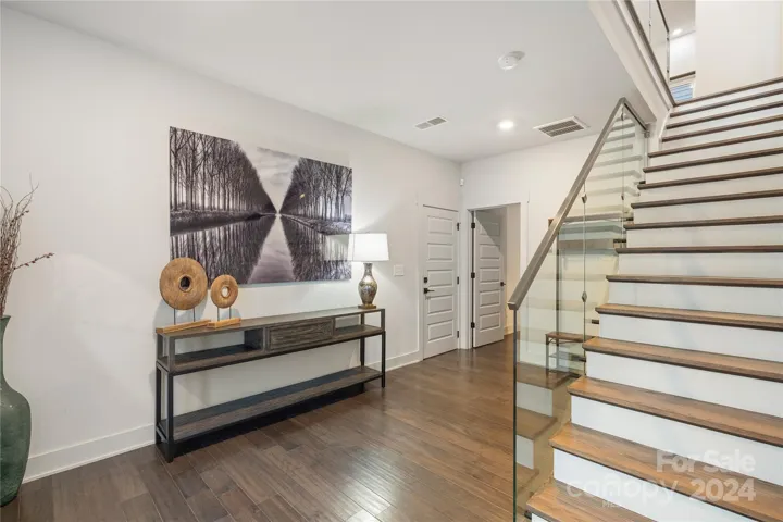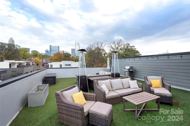 Discover this stunning three-level executive townhouse in the vibrant Third Ward, offering 3 bedrooms, 3.5 bathrooms plus a private rooftop terrace! The open floor plan features gleaming wood floors throughout the living areas, with a light-filled living room boasting a cozy built-in fireplace. The entry-level includes a private guest suite, perfect for visitors or providing a great flex space with private bathroom. The luxury gourmet kitchen impresses with abundant cabinetry, a huge eat-at island, a large pantry, subway tile backsplash, and custom pendant lighting. The primary suite offers a spacious walk-in closet and a spa-like ensuite bath with a tiled shower and dual-sink vanity. Enjoy the breathtaking rooftop terrace with dramatic views, stunning sunsets, and a gas fireplace. Located just minutes from BOA Stadium, popular dining and nightlife, and beautiful parks, this home offers the perfect blend of luxury and convenience.