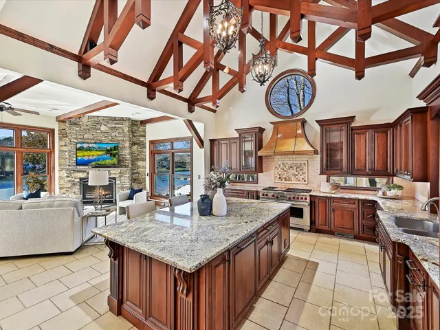 Outdoor spaces are unparalleled, featuring a spacious covered deck with stone flooring, a resort-style pool and spa with pool house, and a private dock equipped with boat slips and jet ski ports. A sandy shoreline provides the perfect spot for lakeside relaxation. Nestled on a sprawling lot with mature trees and direct main channel access, this home offers the ideal combination of luxury, privacy, and recreational opportunities. Whether entertaining or enjoying peaceful moments by the lake, this property captures the essence of upscale lakeside living.