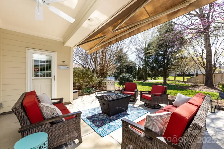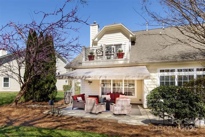 Meticulous end-unit townhome with larger floorplan at The Vineyards. Bright, open main level perfect for entertaining with spacious kitchen, high ceilings, abundant windows, wood floors, corner fireplace, and extended covered patio with retractable awning. Main level has bedroom/office, built-in desk area/drop zone off the garage entry, laundry room with utility sink and storage, dining room, and convenient half-bath. The upper level includes a spacious primary bedroom with trey ceiling, sitting area with private balcony overlooking green space. Beautifully renovated primary ensuite with dual sink vanity, large walk-in shower, and walk-in closet. Two more bedrooms on upper level share a full bath. Even garage exemplifies impeccable maintenance & cleanliness. The Vineyards is amenity-rich offering resort-style living with access to Lake Wylie, walking trails, pools, dog park, clubhouse, tennis courts, pickleball court, playground, boat ramp, fitness center, kayak storage and more.