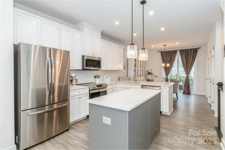 A chef’s kitchen with quartz countertops, custom tile backsplash, and stainless steel appliances