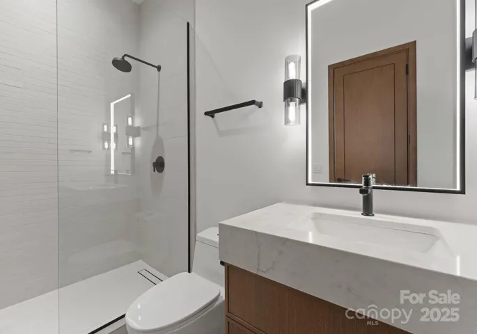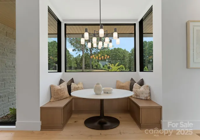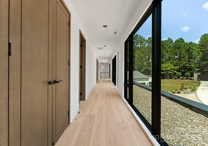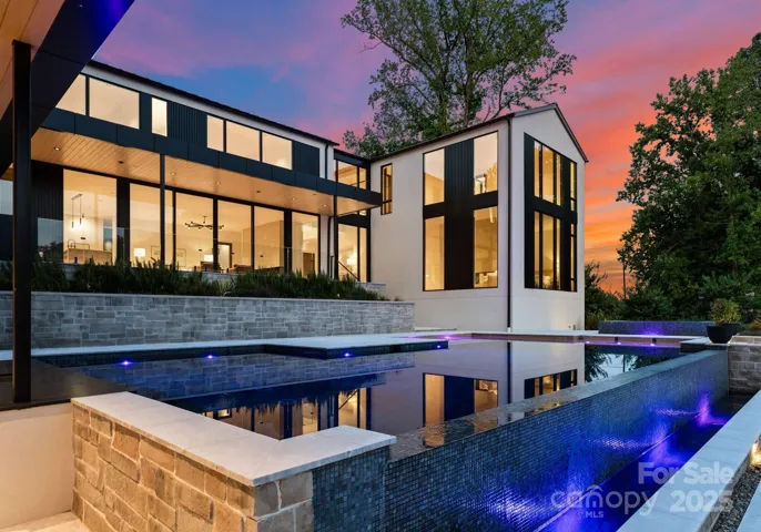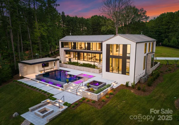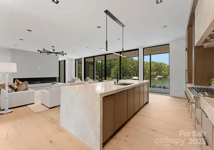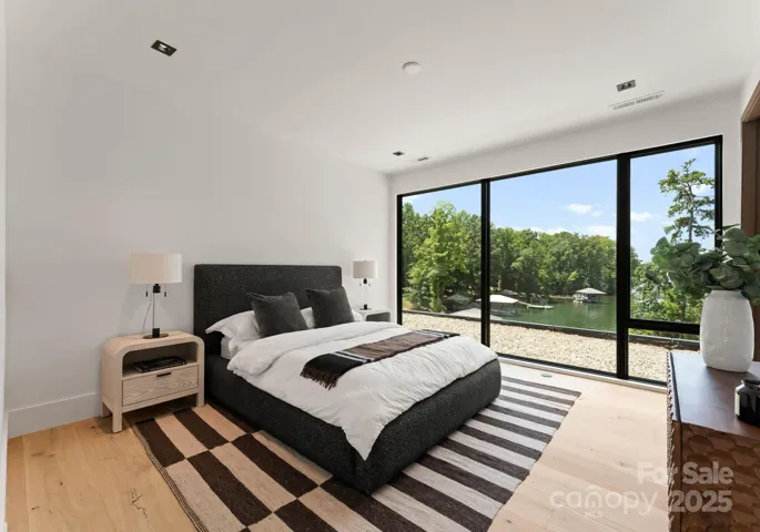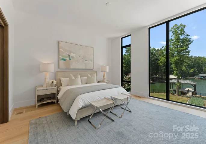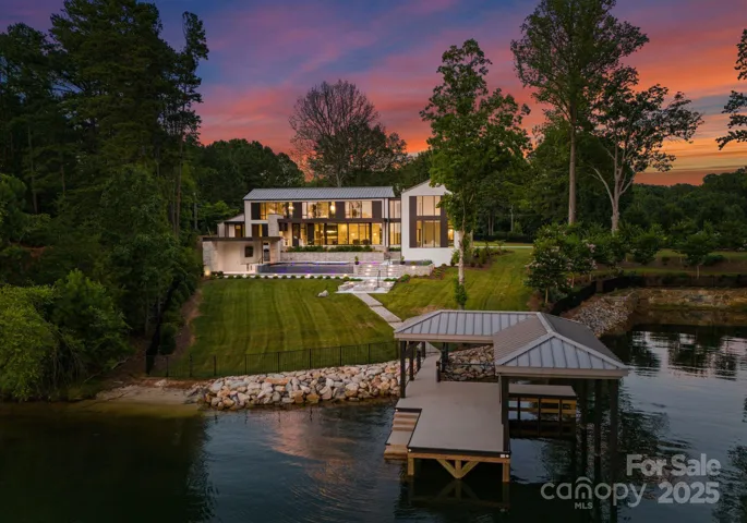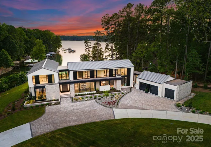 Welcome to a stunning new era of lakefront living. This 2025 custom-built modern estate is perfectly positioned on 1.45 acres of private, gated land with sweeping views of Lake Norman. Designed with the most selective buyer in mind, this home seamlessly blends refined luxury with natural beauty. Step through a striking 10-foot custom oak pivot door into a light-filled open floor plan anchored by 10" wide white oak hardwood floors. The chef’s kitchen is a showpiece featuring an oversized quartzite island that flows into the great room, ideal for effortless entertaining. The main level offers a serene primary suite retreat and flexible office space, while the upper level includes three guest suites, a private gym, theater room, and powder room. Outdoors, experience true resort-style living: a vanishing edge pool, private bar, and an impressive 100" outdoor TV perfect for an evening movie under the stars. A private lakefront beach and dock offer four seasons of recreation and fun!