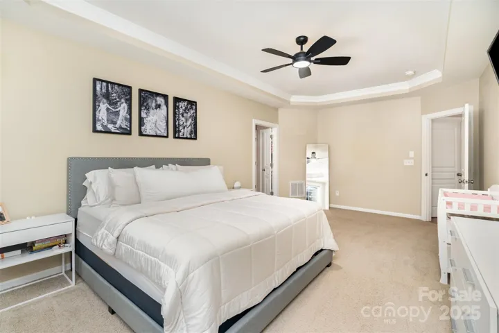 The primary suite on the main level features a tray ceiling, a spacious walk-in closet with built-in shelving, and a luxurious en suite bath with dual sinks, soaking tub, and separate shower. Cable & Internet are included with the HOA!!