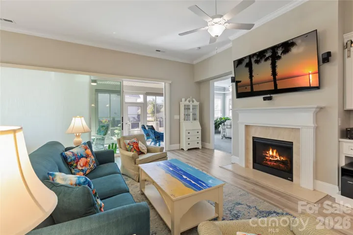 Experience refined living in the 55+ Cresswind community, offering exceptional amenities and convenient access to I-485 and shopping. This LAUREL model, situated on a corner lot, features a open floor plan and numerous custom upgrades, including a gourmet kitchen with induction cooktop, double wall ovens, coffee station, and accent lighting. The extended garage includes a dedicated storage room and epoxy flooring, which is also applied to the lanai and front porch. Energy efficiency is enhanced with foam-sprayed attic insulation, and plantation shutters add a touch of elegance. Double sliding glass doors lead to an enclosed three-season lanai, complemented by a custom paver patio with outdoor kitchen area and gas fire pit. The property is designed for comfort and entertainment, making it a standout residence in the community.