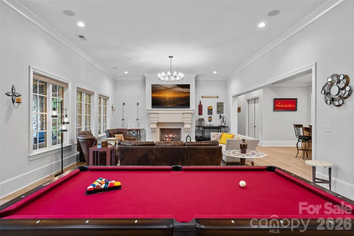 The fully finished basement is designed for elevated entertaining and extended living, featuring a custom 450-bottle wine room, billiard area, full living room with gas fireplace, second kitchen, flex room or gym, bedroom and full bath, as well as a golf cart garage. This level opens directly to the covered patio and outdoor kitchen, creating an ideal flow for hosting and outdoor gatherings while also offering tremendous storage throughout.