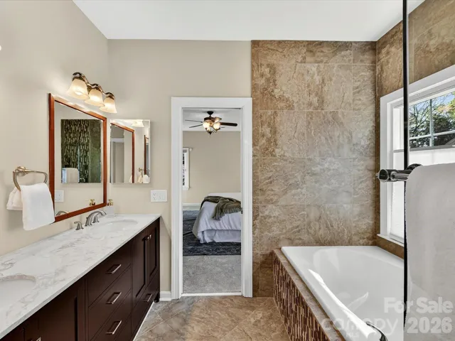 The kitchen flows seamlessly into the inviting great room with a cozy gas fireplace and an adjoining sunny breakfast area. Privately tucked away, the primary suite offers a relaxing retreat with an updated glass-enclosed shower, dual vanity bath, and a custom walk-in closet with built-in shelving.