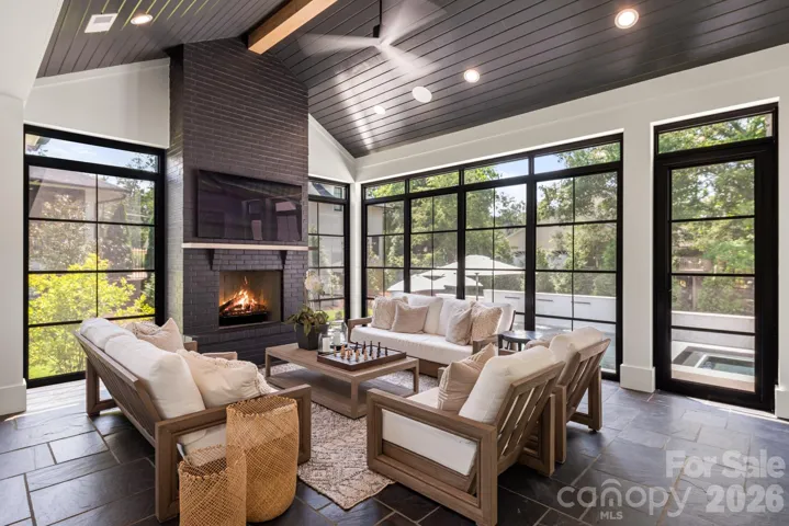 The chef’s kitchen showcases waterfall countertops, a custom hood vent, herringbone backsplash, and a scullery, while an atelier wet bar with wine refrigerator and mirrored backsplash elevates entertaining. Multiple fireplaces anchor interior spaces, complemented by a screened patio with fireplace and a built-in outdoor grilling station.