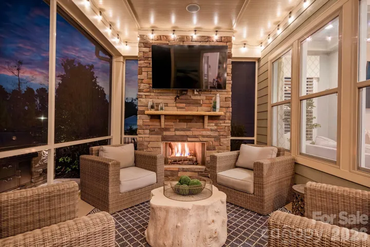 The living room is anchored by a gas fireplace and coffered ceiling with premium lighting, while the screened back porch features a beautiful stone fireplace for year-round outdoor enjoyment. Outdoor living continues with a travertine patio and outdoor kitchen complete with a built-in grill connected to natural gas—ideal for entertaining.