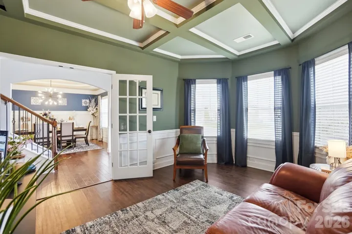 Tucked away on a quiet cul-de-sac in sought-after Kellswater Bridge, this exceptional 4-bedroom, 3-bath home offers over 4,400 square feet of thoughtfully designed living space built for both grand entertaining and everyday comfort. From the moment you arrive, the long driveway, covered front porch, and beautiful curb appeal set the tone. The two-car garage features sealed floors and an electric vehicle charging hookup, blending style with modern convenience. Step inside to a dramatic two-story foyer with soaring ceilings and an immediate sense of scale. A private study and formal dining room, both accented with coffered ceilings, create refined spaces for work and hosting. A main-level guest bedroom with full bath offers ideal flexibility for visitors or multi-generational living. The heart of the home is the expansive living area anchored by a striking stone fireplace, seamlessly flowing into a chef’s kitchen designed to gather. An oversized island with abundant seating, double ovens, walk-in pantry, and generous prep space make entertaining effortless and inviting. Then step outside and the experience continues. The fully fenced backyard is truly an entertainer’s retreat with a $100k renovation completed in late 2024. A large paved patio offers multiple covered living spaces, including a lounge area with mounted TV and a separate covered hot tub area. The outdoor kitchen, stunning stone fire pit, and extensive custom landscape lighting create an unforgettable setting that comes alive in the evening. This backyard was built for long nights and lasting memories. Upstairs, you’ll find a spacious renovated laundry room, two secondary bedrooms, a full bath, and an oversized flex space perfect for a game room, home theater, gym, or playroom. The primary suite serves as a private retreat with impressive proportions, dual walk-in closets, and a spa-like bath featuring a soaking tub and walk-in shower. Built in 2014 with upgraded lighting, flooring and paint throughout. This home also offers access to Kellswater Bridge’s premier HOA amenities including, cable and internet, pool, clubhouse, fitness center, tennis courts, basketball court, volleyball court, picnic area, dog park, walking trails, sidewalks, and street lights. This is more than a home it’s a lifestyle designed for gathering, relaxing, and living beautifully.