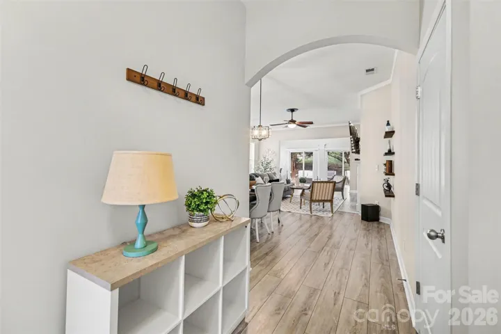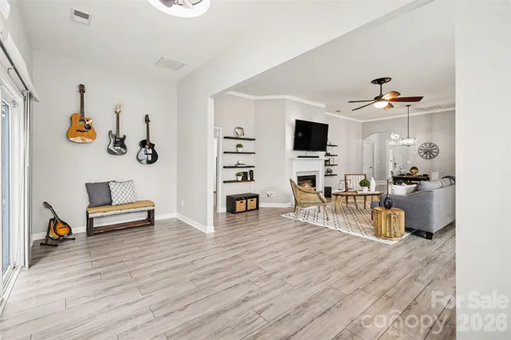 If you’ve been dreaming of bright spaces, open living, and a community that feels like a year round retreat, this is the home that makes it real. This inviting ranch in The Vineyards on Lake Wylie offers effortless one level living with a sun filled, open layout. The kitchen features abundant cabinetry, pantry, stainless appliances, breakfast bar seating, and recent updates including a new microwave and disposal. The great room is warm and welcoming with a gas fireplace and modern floating shelves. Updated flooring, fresh interior paint, and stylish accent wallpaper (approx. 2.5 years old) create a refreshing, move in ready home. Two guest bedrooms sit at the front of the home, while the private rear primary suite includes a walk in closet, dual vanities, soaking tub, and separate shower. Enjoy resort style amenities—pools, clubhouse, fitness center, boat ramp, tennis courts, trails, dog park, and easy access to Lake Wylie. HOA covers lawn care, cable/internet, and trash service. Approx. 2,467 total sq ft with 1,828 heated. Come home to the lifestyle you’ve been waiting for!