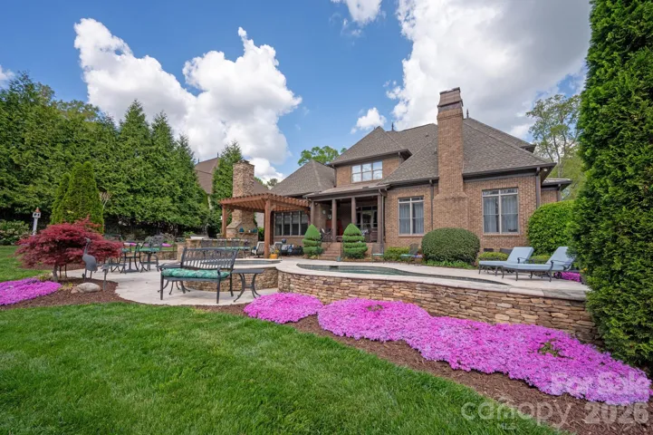 Beautiful luxury home with resort backyard featuring a heated pool with spa, expansive travertine pool deck, outdoor kitchen with bar seating + wood burning fireplace, located in popular gated Chatelaine community in Weddington. Gorgeous interior finishes including custom ceiling details, triple crown molding and hardwood floors on main plus fresh new interior paint and updated designer lighting! Great floor plan features primary bedroom on main with expansive walk in closet with custom cabinetry. Primary opens to outdoor private patio with beautiful seating area and wood burning fireplace. Lovely kitchen features painted custom cabinets, double ovens + gas cooktop, built in fridge, large pantry + a butlers pantry with wine fridge and sink. Kitchen opens to gorgeous keeping area with wood beam ceiling detail and gas fireplace with stone surround. Upstairs features 3 secondary rooms plus an additional primary suite. Second floor also includes a large bonus room with wetbar including sink, fridge and icemaker. Extended 3 car garage includes loads of custom cabinetry. The real gem of this property is the beautifully landscaped backyard retreat which includes both a covered porch and pergola sitting area and offers a ton of privacy. Zoned for Weddington schools!