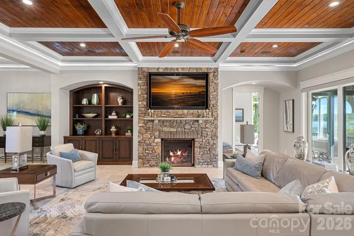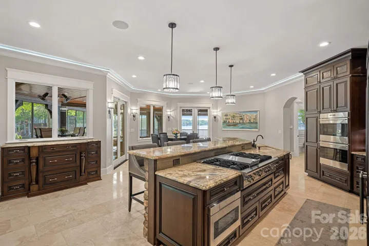 Step outside to your beautifully lit outdoor spaces and follow the path to a covered private dock with deep water access and a private boat ramp and custom stone sea wall and boardwalk.