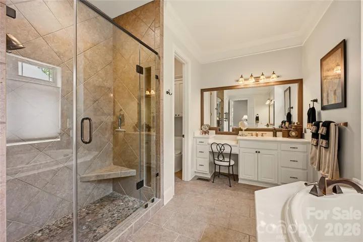 primary suite features a spa tub, heated towel rack, walk-in shower, dual vanities, and