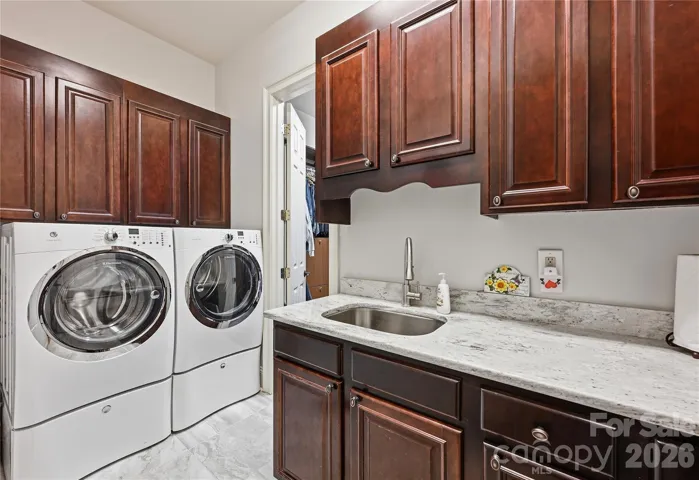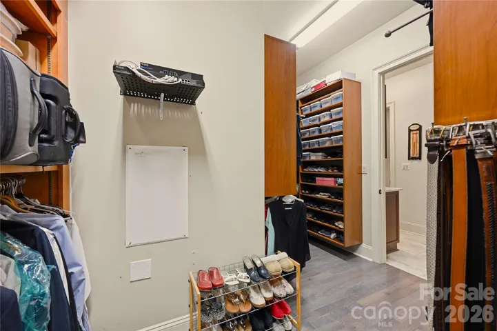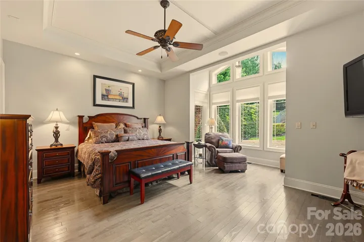 oversized custom walk-in closet. Additional spaces include an office with French doors and a beautiful view of Lake Norman. The second level boasts a loft, billiard/entertainment room with a balcony overlooking the pool, media/theater room and a finished storage room with a Murphy bed. Outdoor living shines with a fully fenced, professionally landscaped backyard, Pebble Tech kidney-shaped pool with waterfall, travertine deck,