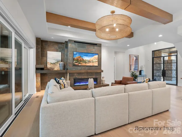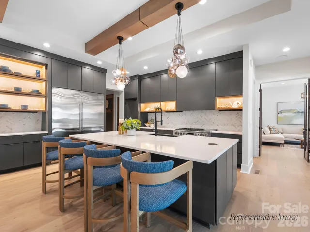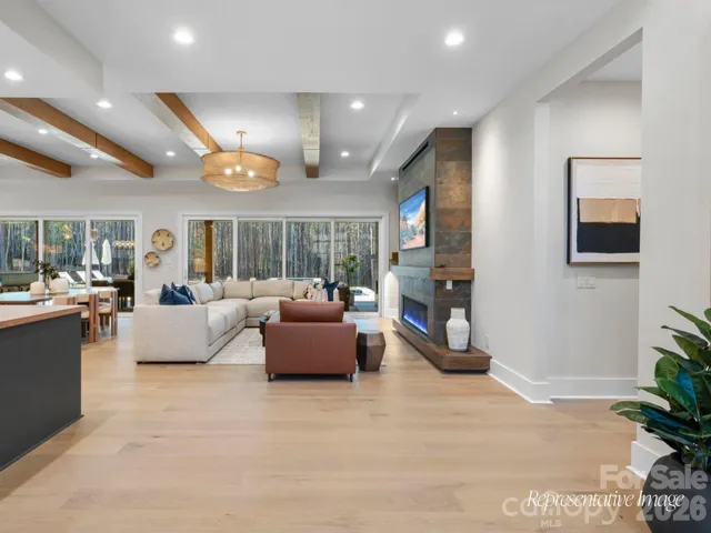 The chef’s kitchen features professional-grade appliances, quartz countertops, an oversized island, and a scullery, open to the casual dining area and great room with a fireplace and wet bar. Two 16' sliding glass doors span 32' across the rear of the home, connecting to a 45' covered porch for seamless indoor-outdoor living.