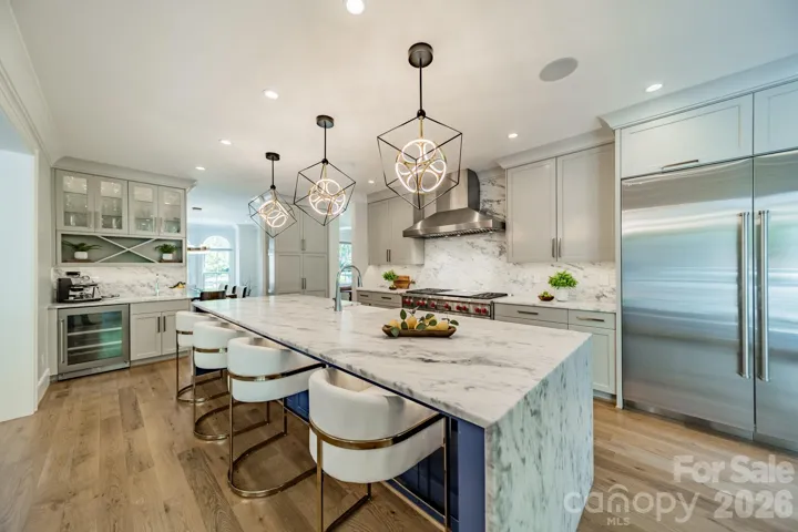 The kitchen is designed to balance performance and style, anchored by Fantasy White honed quartzite surfaces, including a waterfall island and full-height backsplash. A professional-grade appliance suite, custom cabinetry and dual laundry areas support both everyday living and entertaining.
