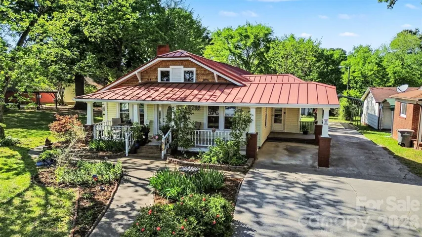 Charming bungalow with a rocking chair front porch on almost 1 acre in Cabarrus County! This rare Concord property offers 3 bedrooms, 2 bathrooms, and flexible living space ideal for multi-generational living, in-law quarters, guest suite, roommate setup, or Airbnb potential. The heated and cooled sunroom includes a fridge, sink, and stove/oven setup for guests or extended family, and if the guest setup is not needed, the kitchen door can be removed for a more traditional flow. Outside, the long lot features a barn, chicken coop, Tiki Hut, workshop area with water and electricity nearby, covered carport, and detached carport. The workshop provides great additional space but does need some repair. Enjoy the backyard oasis with a gas lantern, gas grill, raised flower beds, four mature pecan trees, several blueberry bushes, fig tree, peach trees, elderberry bushes, and an herb garden. With well-established landscaping, room for gardening and homesteading, major updates including new windows (2022), HVAC (2024) with replaced ductwork, updated plumbing, water filtration system, and LVP flooring, this property offers charm, versatility, and hard-to-find acreage in Concord. Refrigerator in the kitchen and sunroom convey.