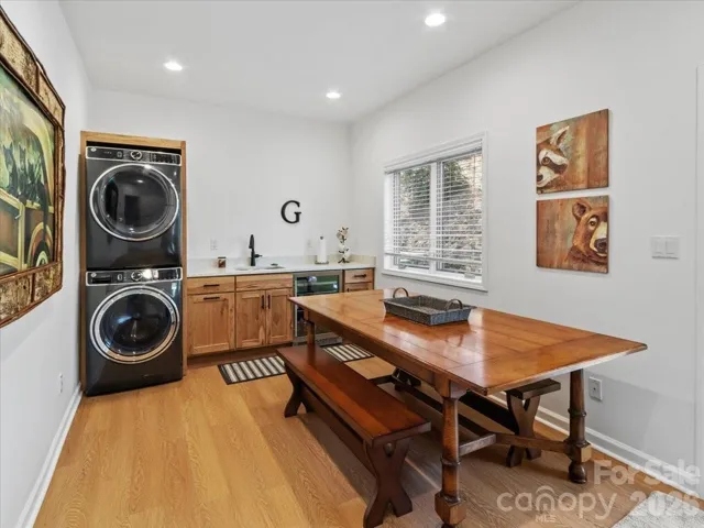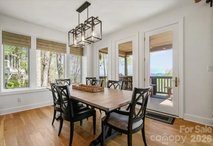 This beautifully updated custom home sits on over half an acre and offers breathtaking long-range mountain views in the peaceful and private Springhouse Drive neighborhood of MOUNTAIN AIR. Blending rustic charm with modern luxury, the wood and stone exterior is complemented by stone walls and a tranquil waterfall feature at the entry. Designed for ideal main-level living, the open floor plan includes a fully renovated kitchen with a handy pantry at your fingertips, plus a second pantry closet, a stylish powder room, a spacious dining area, and a great room with a soaring wood ceiling and a striking stone fireplace. The main level also features the primary suite with a luxury en suite bath and private laundry. The upper level offers a versatile guest suite or office with its own full bath and private deck—perfect for visitors or remote work. The expansive lower level is ideal for family or guests, with a large den, two bedrooms, two full baths, a kitchenette with additional laundry, multiple porches, and a private entrance. Offered furnished with a few seller exceptions. A newer electric golf cart is negotiable. Located close to the heart of the community and just a short distance from Club amenities—including dining, fitness center, tennis courts, golf, and year-round events and activities, available with separate Club membership.