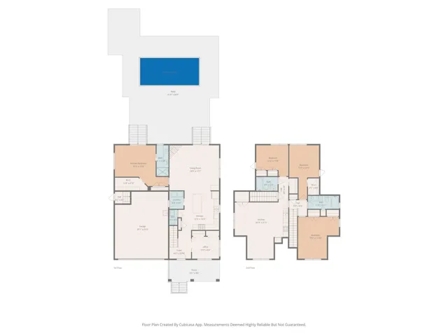 The main level opens through a striking wrought iron front door onto beautiful oak hardwood floors. The kitchen delivers: premium GE Monogram appliances, gas range, custom brick backsplash, dry bar with beverage fridge, and a quartz island that seats 8–10. The living room with gas fireplace opens directly to the pool area. Main-level primary suite walks out to the pool with a king bed and custom headboard, built-in closet, dedicated makeup vanity, and a spa-caliber bath with custom mirrors and tile. Dining Room / Office, laundry, and powder room complete the ground floor.