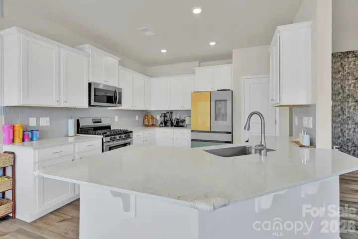 Spacious kitchen featuring stainless steel appliances, quartz countertops, a stylish tiled backsplash, and a large kitchen island – perfect for cooking and entertaining