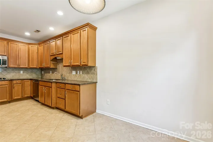 The kitchen is well-appointed with ceramic tile flooring, granite countertops, maple cabinetry, a gas cooktop, double ovens, and stainless steel appliances—ready for both everyday living and hosting.