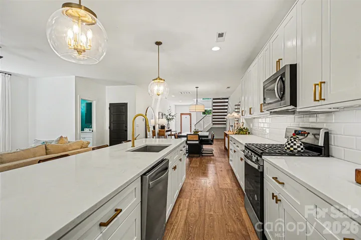 Inside, the home opens into a bright, airy layout filled with natural light and upscale touches throughout. Wide-plank flooring flows seamlessly across the main living areas, complemented by a soft, neutral palette and designer lighting that enhances the home’s modern aesthetic. The kitchen is a true centerpiece, featuring an oversized island with seating, sleek cabinetry, and a polished, open design that connects effortlessly to both the dining and living spaces—ideal for entertaining or everyday living.