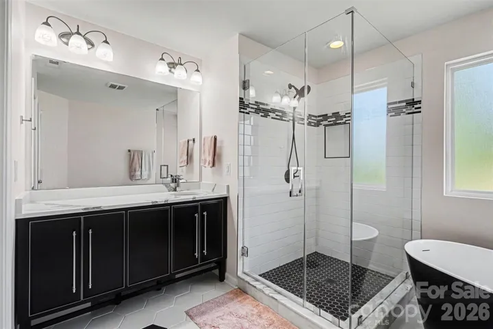 Upstairs, the spacious primary suite provides a true retreat, complete with an updated bathroom featuring a sleek dual vanity, modern finishes, a separate glass-enclosed shower, and a freestanding soaking tub that creates a spa-like feel. Additional bedrooms offer flexibility for guests, a home office, or hobbies, while the upper-level laundry adds everyday convenience.