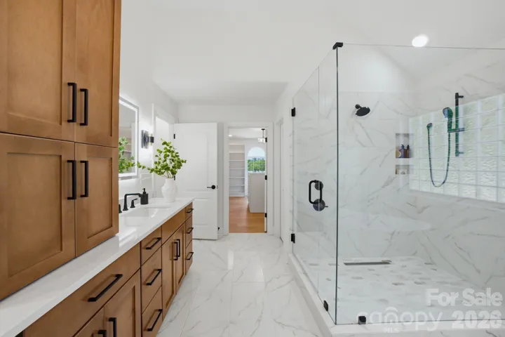 Upstairs, the primary suite becomes your personal retreat. High ceilings, detailed trim, and a sense of calm define the space while the reimagined primary bath delivers a spa-like experience with a sprawling dual vanity, smart mirrors, a freestanding soaking tub, and an elegant frameless glass shower.