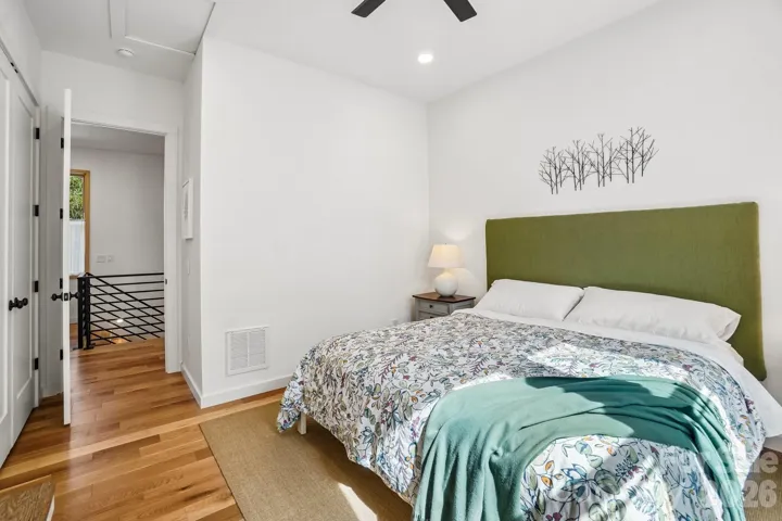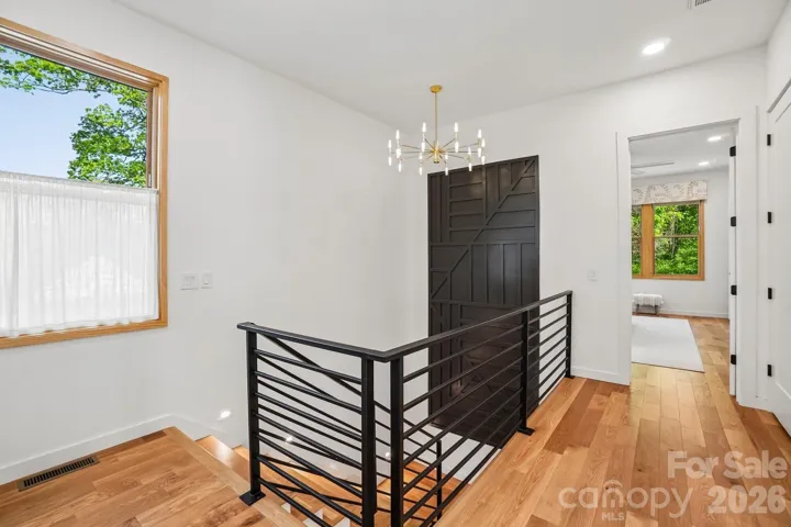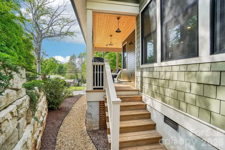 Historic charm meets modern elegance in this exceptionally beautiful home, built by a highly regarded local builder! A gracious wraparound porch sets the tone, inviting you to relax and unwind. Inside, 10-foot ceilings, hardwood floors throughout and expansive windows create a bright, airy feel. The main level features an open floor plan and a chef's kitchen with a quartz waterfall island, abundant cabinetry, and a dreamy walk-in pantry. A gas fireplace with a pull-down TV adds both style and function. A spacious guest bedroom and full bath complete the main floor. Upstairs, illuminated stairs with a custom railing lead to three bedrooms, including a generous primary suite with motorized room-darkening shades, a spa-like ensuite bath with waterfall shower and soaking tub, and a walk-in closet with custom built-ins. Low-maintenance yard backs up to a wooded area for added privacy and peaceful views. This home is so conveniently walkable to local restaurants, parks, and tennis/pickleball courts—offering the perfect blend of charm, comfort, and convenience. A must-see!