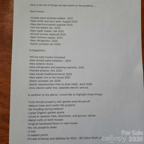 Such a unique and charming opportunity for the buyer wanting less than 5 minutes to downtown Hendersonville, walking distance to Jackson Park, darling 3 bed/1 bath main home, 1 bed/1 bath bungalow for Mom or income producing vacation rental on .41 acres, and almost 1/2 an acre additional current organic garden that could be a buildable lot! all with the improvements and updates that you could want! Original hardwood floors in the cottage, with large eat-in kitchen w/tons of cabinets and counter space, WBFP and built in bookcases in living room, and a master bedroom that holds a king size bed! 3 season room great for relaxing w/your glass of wine, after jumping out of the hot tub in the cool spring evening. Stroll down to the bungalow w/new septic system, and see if Mom wants to walk down to the Park. Play with rover in the fenced in yard, while growing your own vegetables! Mechanicals & all windows replaced in last 5 years. Life is GOOD!