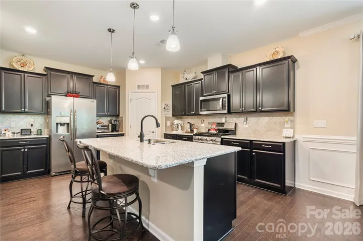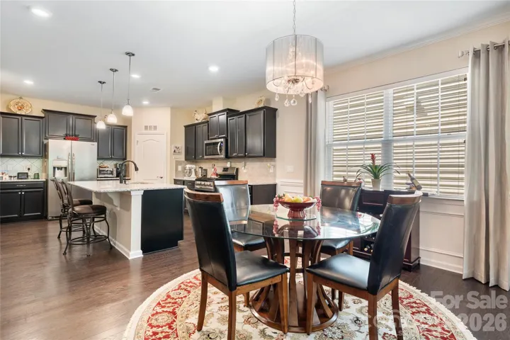 The kitchen overlooks the main living area and is beautifully appointed with a large island with seating, granite countertops, stainless steel appliances, tile backsplash, gas range, pantry, and abundant cabinetry for storage. Thoughtful upgrades include convenient pull-out drawers in all lower kitchen cabinets for easy organization and access. Just off the kitchen, the dining area is highlighted by a contemporary chandelier and flows seamlessly with the rest of the home, creating an ideal layout for entertaining.