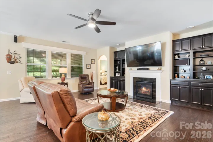 A covered entryway welcomes you in through an elegant etched glass door, setting the tone for the warm and stylish interior, enhanced by wooden blinds and custom wooden cornices on all windows throughout the home. The open-concept floor plan is anchored by a spacious living room featuring a gas log fireplace with a classic mantle, flanked by built-in bookcases (or optional shelving to suit your style) - perfect for both relaxing evenings and hosting guests. Beautiful wood floors run throughout the main living areas, adding warmth and continuity.