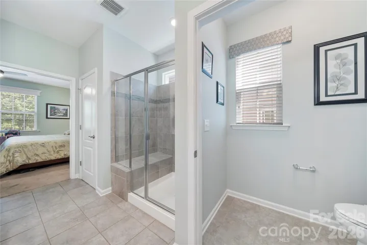 The spacious primary suite provides a private escape, featuring stylish barn doors and an ensuite bath complete with a dual sink vanity, pull-out storage in the vanity, a glass-enclosed shower with bench seating, and a generous walk-in closet. A well-sized secondary bedroom with Murphy bed (to convey with home) is positioned at the front of the home with access to a full hall bath, making it perfect for guests or additional flex space.