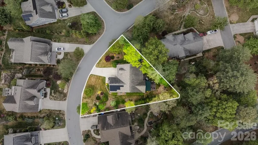 Enjoy serene Cul-De-Sac living with sustainable luxury! Discover the perfect blend of design and efficiency in this lovely home, tucked away in a quiet, premier cul-de-sac South Asheville community. The interior greets you with gleaming hardwood floors and an expansive great room featuring vaulted ceilings, custom built-ins, and a cozy fireplace with live edge mantle designed for comfort on those chilly evenings. The main-level primary suite is a true owners retreat. The bedroom boasts its own vaulted ceilings and a huge walk in closet. With the private access directly to the rear patio, whether you're enjoying a quiet morning coffee or a late-night breeze, this seamless indoor-outdoor flow defines relaxation. Step outside to your private sanctuary. The partially covered patio overlooks a perfectly manageable, lush backyard framed by vibrant perennial gardens. Gather around the integrated fire pit for effortless entertaining in a private setting. Do you appreciate green energy and high value? Enjoy the luxury of modern sustainability. This home features discreetly placed solar panels offering a nice aesthetic. This along a tankless gas water heater and zoned heating and cooling allow for drastically low energy bills. View the attached "Upgrades List" for a full breakdown of the premium features throughout this home!