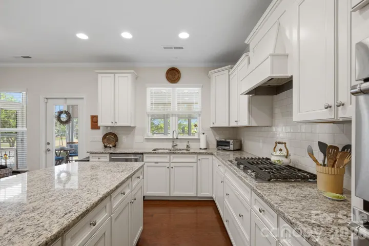 Designed for both everyday living and entertaining, the formal dining room features detailed wainscoting accents. The kitchen is thoughtfully positioned at the rear of the home and impresses with a large island, granite countertops, tile backsplash, stainless steel appliances, and a gas range, along with a sunny breakfast nook for casual meals. Just beyond, a light-filled sunroom offers peaceful backyard views and an inviting place to unwind.