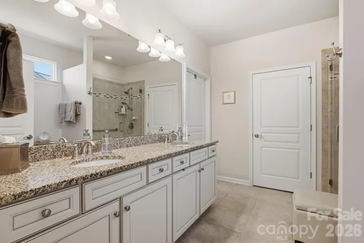 The primary suite, also located at the back of the home for added privacy, features a spacious ensuite bath with dual vanities, a glass-enclosed walk-in shower, dedicated vanity space, and a generous walk-in closet. Two well-sized guest bedrooms are situated at the front of the home with access to a full hall bath, providing flexibility for visitors or additional living space.