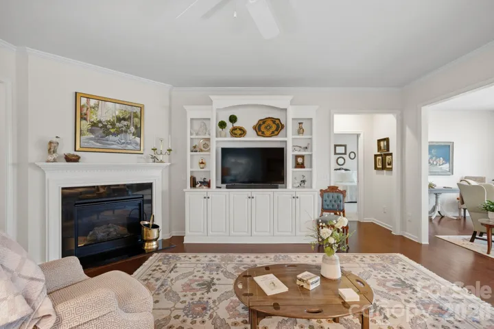 A charming paver walkway leads to a covered front entry, setting a welcoming tone. Inside, the foyer opens to a private home office framed by elegant double glass doors - an ideal space for remote work, creative pursuits, or quiet study. At the heart of the home, the open-concept great room invites gathering and relaxation, with a gas log fireplace and classic mantle.