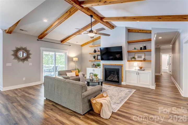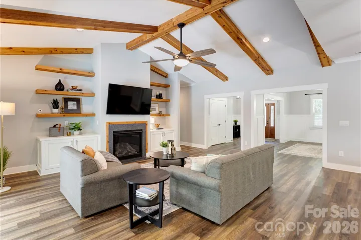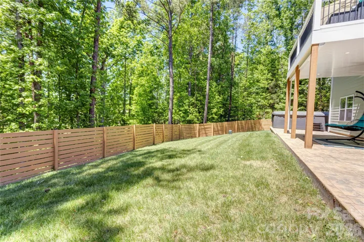 Step inside the inviting, open-concept home designed for effortless entertaining. The chef-inspired gourmet kitchen is anchored by a large quartz island featuring a gas cooktop and built-in microwave, flowing seamlessly into the dining and breakfast areas. The adjacent family room boast a cathedral ceiling with exposed beams, a cozy fireplace, and custom built-ins. Enjoy access to the back deck directly from this central gathering space. The main level is completed by a split-bedroom floor plan with 2 full baths, ensuring ultimate privacy.The secluded main floor Primary Suite is a luxurious retreat with cathedral ceilings. Its opulent primary bath features elegant tile floors, a freestanding soaking tub, and a huge walk-in tiled shower. A secondary Primary Suite is located on the lower level, offering flexible living arrangements.The full, walk-out basement is designed as an entertainment hub, featuring a large family room that flows onto the stamped concrete patio. The patio is equipped with a luxurious heated Four Winds swim spa, perfect for year-round swimming or relaxing. This level also includes a versatile bonus room that can be utilized as a playroom, large office, or dedicated gym.Relax on the classic rocking chair front porch or the back deck overlooking the downstairs patio. The private backyard is fully enclosed with a custom wood fence (featuring three gates for easy access) and offers a serene view of mature hardwood trees and a beautiful tree canopy. The property provides extensive parking with a 2-car garage on the main level and a massive, oversized garage/storage area in the basement.This home offers peace of mind with maintenance-free elements including Trex decking, GutterGuard, a stamped concrete patio, and transferable termite and HVAC bonds.Enjoy quick access to everything, as you are less than five minutes from I-485, major shopping, dining, and local hospitals. Don't miss this rare opportunity for luxury, acreage, and convenience without the restrictions of an HOA.